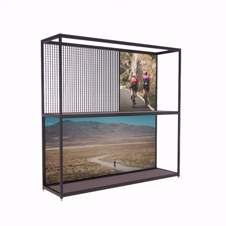Stelvio Large is een base frame van 3M breed en 2700 mm hoog, ontworpen voor de presentatie van bakfietsen. De hoge en robuuste constructie zorgt voor een sterke visuele impact en maakt het mogelijk om bakfietsen duidelijk en professioneel in de winkelruimte te presenteren.