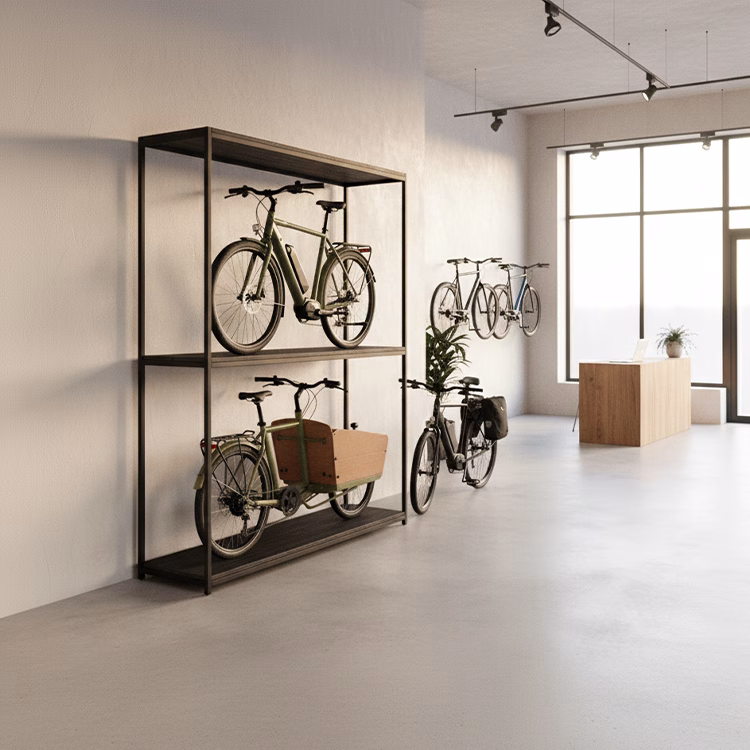 Optimise the presentation of cargo bikes in your store with this Cargo bike display. Specially designed for bike shops that want to make efficient use of available space while maintaining a clear and stylish appearance.
